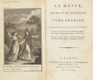[LEWIS (Matthew Gregory)]. Le Moine, traduit de l'anglais. Paris : Maradan, an V - 1797. — 4 volumes in-18, 130 x 78 : frontispice, 178 pp. : frontispice, 211 pp. : frontispice, 210 pp. : frontispice, 270 pp.
