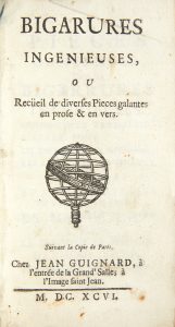 [L'HERITIER DE VILLANDON (Marie-Jeanne)]. Bigarures ingenieuses, ou Recueil de diverses pieces galantes en prose & en vers. Suivant la copie de Paris : Jean Guignard, 1696. — In-12, 133 x 73 : (4 ff.), 352 pp.