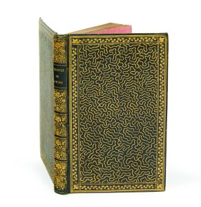 Maroquin bleu, plats couverts de filets vermiculés dorés, encadrés de pampres dorés, dos lisse à compartiments ornés de branches et de fleurs sur fond doré à mille points, chaînette dorée intérieure, doublures de soie rose bordée d'une roulette dorée, gardes de soie rose, tranches dorées (P. Bozérian).