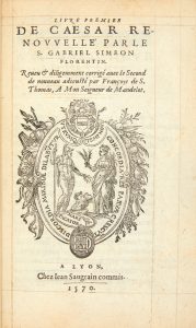 SIMEONI (Gabriello). Livre premier [et second] de Caesar renouvellé par le S. Gabriel Simeon florentin. Reveu & diligemment corrigé avec le Second de nouveau adiousté par Françoys de S. Thomas, A Mon Seigneur de Mandelot. Lyon : Jean Saugrain,...