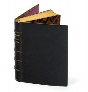 Maroquin janséniste brun, dos à nerfs, doublures de maroquin bordeaux bordé d'un filet doré, garde de soie brochée bordeaux rouge et noir à motifs modernes, tranches dorées sur témoins, couverture conservée (Noulhac).