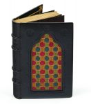 Maroquin noir, grand décor mosaïqué de maroquin de plusieurs tons figurant un vitrail dans un encadrement à froid sur le premier plat, dos à nerfs, large cadre de maroquin noir intérieur, orné de filets et fleurons dorés, centre de la première doublure comprenant une composition en couleurs sur parchemin, centre de la seconde doublure de soie aubergine, gardes de soie aubergine, tranches dorées sur témoins, couvertures et dos conservés (Marius