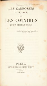 MONMERQUÉ (Louis Jean Nicolas). Les Carosses à cinq sols, ou les omnibus du dix-septième siècle. Paris : imprimerie de Firmin Didot, 1828. — In-12, 173 x 101 : 74 pp., (1 f.), 1 fac-similé.