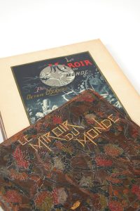 Broché, couverture rempliée, liseuse en cuir recouvert de motifs japonisants, portant le titre de l'ouvrage en lettres dorées sur le premier plat, doublée de satin broché avec coins intérieurs en cuir ornés de motifs japonisant.