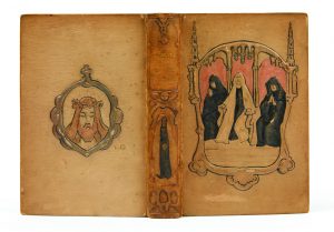 Maroquin beige à long grain, plats et dos ornés d'une composition modelée et colorée, figurant sur le premier plat 3 nones priant, dans un cadre gothique, sur le second plat le portrait en médaillon du Christ et sur le dos une none dans un décor gothique, tête dorée, non rogné, couverture conservée (Louis Dézé).