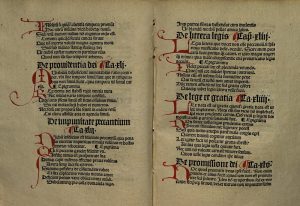 Exceptionnel exemplaire non rogné et orné tout du long de grandes initiales peintes en rouge, dont les hastes et les antennes se prolongent et s'entrelacent harmonieusement dans les marges pour former un ensemble extrêmement séduisant.