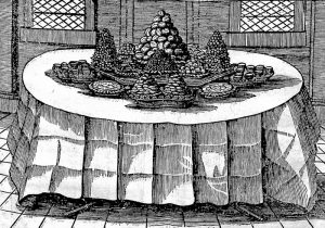 L'illustration comprend deux plans de table dans le texte et une planche hors texte repliée montrant une table chargée de mets, le tout gravé sur bois.