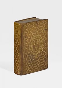 Petit in-8, maroquin citron, triple filet doré, plats couverts d'un semé de fleurs de lis, armoiries au centre, dos lisse orné du même semé, coupes ornées, tranches dorées (Reliure de l'époque).