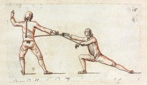 Traité d'escrime inédit, illustré de dessins à la plume rehaussés à la sanguine, et truffé de quelques gravures reprenant les dessins.