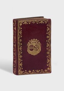 paniers fleuris, armoiries au centre, dos lisse orné, ange musicien doré dans un caisson, dentelle intérieure, tranches dorées (Reliure de l'époque).