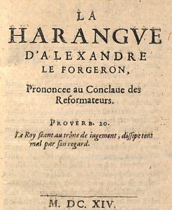 I. La Harangue d'Alexandre le Forgeron, prononcée au Conclave des Réformateurs. S.l., 1614, 16 pp.