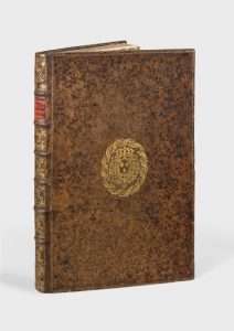 doré, armes dorées au centre des plats, dos orné du double L couronné et de fleurs de lis, tranches mouchetées (Reliure de l’époque).
