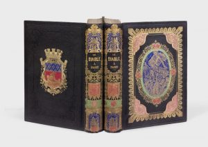 2 volumes in-8, percaline polychrome ornée au centre du diable portant sa hotte surplombant des parisiens, dos orné d'un décor polychrome, second plat orné des armes de la ville de Paris, tranches dorées (Lenègre Relr).