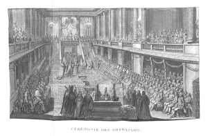 Édition originale de cet ouvrage « savant et curieux », écrit Guigard, illustré de 40 planches hors texte, dont un frontispice et 6 dépliantes, gravées au burin par Patas, Gobet et Pichon pour le Sacre et couronnement de Louis XVI (1775).