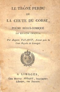 – VI. TALABOT (Auguste) : Le Trône perdu, ou La Chute du Corse, poëme héroï-comique en quatre chants. Limoges, Martial Ardant, s.d [1814]., 64 pp. Davois III, 188. Absent de Germond.