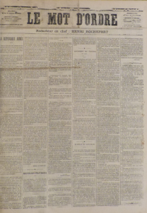 [ROCHEFORT (Henri)]. Le Mot d'ordre. Paris, Impr. Schiller, 1871. 87 livraisons d'une feuille chacune en un volume grand in-folio, bradel demi-toile verte avec coins (Reliure moderne).