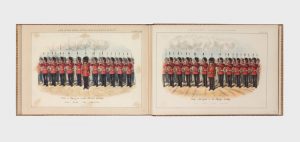 SIMKIN (Richard). Life in the Army Every-day incidents in camp, field, and quarters, sketched by R. Simkin. Londres, Chapman & Hall, [1889]. In-4 oblong, maroquin rouge, triple filet doré, dos orné de doubles caissons et fleurons dorés,...