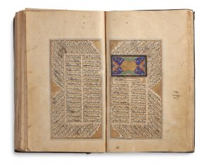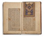 En 3 volumes successifs introduits par une double page enluminée : texte disposé comme sur le reste du manuscrit mais en réserve à l'encre noire sur fond doré et précédé d'un frontispice rectangulaire enluminé à l'or et en polychromie de rinceaux floraux sur fond bleu, autour d'un médaillon polylobé doré flanqué d'appendices fleuronnés. 1er frontispice précédé d'une Shamseh richement enluminée à l'or et en polychromie de rinceaux végétaux et fleurons.
