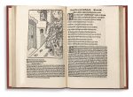 Petit in-4, complet CVII-[1]f, [collation : a8, b4, c8, d4, e8, f4, g8, h4, i8, k4, l8, m4, n8, o4, p8, q4, r8, s4], lettres rondes et en caractères gothiques, avec le titre en rouge et noir, avec un bois au titre et marque typographique de l'imprimeur de Marnef avec 115 figures sur bois (114 + bois au titre).