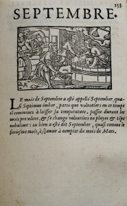 12 vignettes sur bois, représentant les travaux des mois de l'année. Elles portent la marque simplifiée des de Marnef et sont tirées (sauf pour le mois d'avril) du calendrier des Heures à l'usage de Paris que Jacques Kerver donna en 1565.