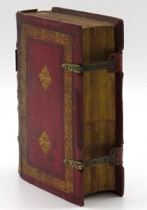 Reliure avec ais de bois biseautés recouverts de basane maroquinée rouge de l'époque, large roulette dorée et filet à froid sur les plats, fleurons dorés.