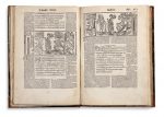 et A6r registre ; CC6r colophon ; CC6v blanc], erreurs dans la foliotation (XCII (92), XCV (95), et CVI (106) chiffrés par erreur CXII (112), CXV (115), and CXVI (116)), commentaires sur deux colonne encadrant le texte de Térence ; initiales gravées ; titre orné d'une grande gravure sur bois et le texte illustré de 6 grandes gravures sur bois à pleine page (A6v, F2, L1v, O2, T1v, et Y6v) ainsi que de 142 plus petites, parfois répétées ; nombreuses annotations manuscrites à l'encre (marginales et interlinéaires, ff. IX-XIX).