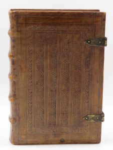 Reliure de veau fauve pastiche estampé à froid avec roulettes et filets, dos à nerfs, fermoirs en laiton.