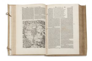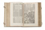2 parties en un volume in-folio, [12]-XVII-CCLVIII-XCVI pp. ; [12]-XIII-CCCCCC-[16] pp. [collation : a6, b-q8, r6, aa-ff8 ; A6, B-Z8, AA-OO8, PP6, +8) ; titre en rouge et noir, est placé dans un encadrement gravé sur bois, orné de rinceaux et de putti ; titre séparé pour l'Enéide (même date 1529) ; glose et commentaires sur deux colonnes entourant le texte en fenêtre centrale ; lettrines ornées ; 205 gravures sur bois, certaines répétées, souvent à demi ou trois-quarts de page, bien encrées.