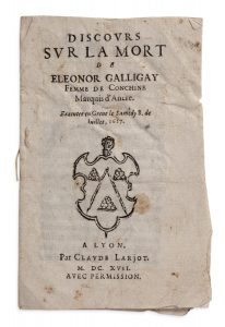 Léonor Dori ou Galigaï (1568-1617), confidente de Marie de Médicis, fut l'épouse de Concini. Elle sera emportée par la disgrâce de Concini et jugée, accusée de sorcellerie et de médecine «juive». Elle sera décapitée et son corps sera brûlé place de Grève à Paris. Après la mort de la marquise, les pamphlets changent de ton et brossent un portrait complètement différent de la cameriera. Plusieurs libelles, à l'instar du Discours sur la mort d'Eleonor Galligay et des Larmes de la marquise d'Ancre, représentent l'épouse de Concini affrontant valeureusement son sort : «Elle monte courageusement sur l'échaffaut, se resoult de mourir constamment, l'executeur là présent, après luy avoir couppé ses cheveux, la bande cependant que les Docteurs la disposoient à rendre son esprit à Dieu, elle toute resolüe se debande & ne s'effraya aucunement du coup qu'elle ne pouvoit eviter» (pp. 7-8).
