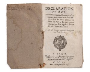 [LOUIS XIII]. Declaration du roy, portant que toutes monnoyes d'or legeres des païs estrangers, seront converties en especes d'or de poids portans le nom du Roy ; que la fabrication des escus d'or de France sera continuée, & que toutes especes...