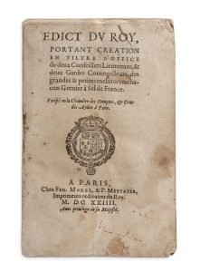 [LOUIS XIII]. Edict du roy portant creation en tiltre d'office de deux conseillers lieutenans, & deux gardes controolleurs des grandes & petites mesures en chacun Grenier à sel de France, A Paris, F. Morel et P. Mettayer, 1624. In-12, 72 pp., non...