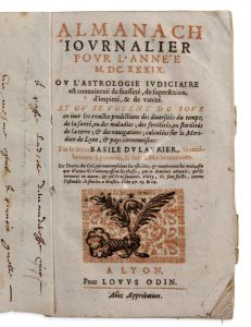 [LYON]. [MÉDECINE]. DULAURIER (Basile). Almanach journalier pour l'année MDCXXXIX ou l'astrologie judiciaire est convaincuë de fausseté, de superstition, d'impiété, & de vanité... par le Sieur Basile Dulaurier, gentilhomme lyonnois, & subtil...