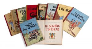 HERGÉ. Tintin. 10 albums, certains en édition originale, la majorité en mauvaise condition. - Le Crabe aux pinces d'or, Casterman, 1947. Dos rouge, 4e plat B1. - Les 7 boules de cristal, Casterman, 1947. Dos jaune, 4e plat B1. EO - Tintin en...