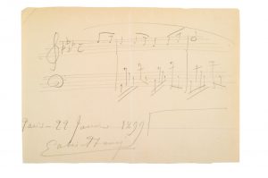 FAURE (Gabriel). 1845-1924. Compositeur. P.A.S. Paris, 22 janvier 1899. 1 pp. oblong au crayon.