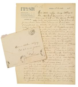 APOLLINAIRE (Guillaume). 1880-1918. Écrivain poète. L.A.S. «ton Gui» à son amie Lou. (Nîmes), 1er février 1915. 2 pp. in-4, en-tête du Grand Hôtel du Midi & de la Poste à Nîmes ; avec enveloppe à l'adresse de son appartement parisien,...