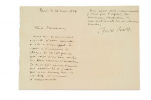 Breton remercie son correspondant d'avoir répondu si vite à son appel ; (...) Je reçois à l'instant le chèque de 13525 francs que vous avez bien voulu me faire adresser d'Amsterdam. Je vous prie encore d'excuser ma démarche et j'espère que vous voudrez bien ne pas trop m'accuser d'importunité (...).