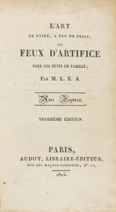 1825. LIBRO : (PIROTÉCNIA). M. L. E.A. : L´ART DE FAIRE, A PEU DE FRAIS, LES FEUX D´ARTIFICE pour les fêtes de famille. Paris : Libr.-Éd. Audot, 1825. 8º. 2 h. + 104 p. + 24 p. + IX lám.