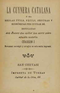 1890, 1894 y 1891. LIBRO : (GASTRONOMÍA-COCINA). LA CUYNERA CTALANA Ó SIA REGLAS ÚTILS, FÁCILS, SEGURAS Y ECONÓMICAS PER CUYNAR BÉ. San Gervasi : Imp. Vda. de Torras, 1890, 1894 y 1891. 4 partes enc. en 8º menor.