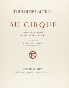 1952. LIBRO : (ARTE). TOULOUSE-LAUTREC: AU CIRQUE. TRENTE-NEUF DESSINS AU CRAYON DE COULEURS. Monte-Carlo : Éd. du livre, 1952. Folio menor. 8 h. + 39 lám. + 4 h.