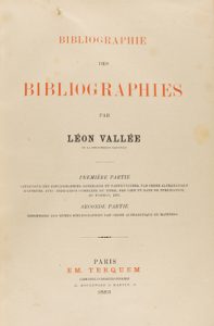 1883. LIBRO : (BIBLIOFILIA). VALLEE, LEON: BIBLIOGRAPHIE DES BIBLIOGRAPHIES. París : E.M. Terquem, 1883. 4º. 4 h. + 773 p.