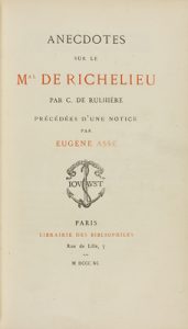 1890. LIBRO : (BIBLIOFILIA). RULHIÈRE, C. DE: ANECDOTES SUR LE MAl. DE RICHELIEU. Paris : Libr. des Bibliophiles, 1890. 8º. 2 h. + XIX + 71 p.
