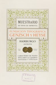 1903 ca. LIBRO : (BIBLIOFILIA). GENZSCH Y HEYSE: MUESTRARIO DE TIPOS DE IMPRENTA. CARACTERES DE TEXTO, TIULARES Y DE ADORNO, FANTASIAS Y VIÑETAS. Hamburgo : [Genzsch y Heyse], [1903]. 4º. 4 h. (portadilla, portada impresa a tres tintas...