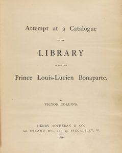 1894. LIBRO : (BIBLIOGRAFÍA). COLLINS, VICTOR: ATTEMPT AT A CATALOGUE OF THE LIBRARY OF THE LATE PRINCE LOUIS-LUCIEN BONAPARTE. [Londres] : Henry Sotheran & Co., 1894. 4º menor. XI + 718 p.