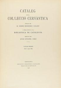 1916. LIBRO : (BIBLIOGRAFÍA). GIVANELL I MAS, JOAN: CATÀLEG DE LA COL·LECCIÓ CERVÀNTICA FORMADA PER D. ISIDRO BONSOMS I SICART I CEDIDA PER ELL A LA BIBLIOTECA DE CATALUNYA. Barcelona : Institut d´Estudis Catalans, 1916. 4º.