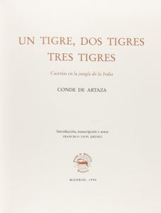1996. LIBRO : (CAZA-BIBLIOFILIA). ARTAZA, CONDE DE: UN TIGRE, DOS TIGRES TRES TIGRES. Cacerías en la jungla de la India. Madrid : Cículo Bibliofilia Venatoria, 1996. 4º mayor. 217 p. + 2 h.