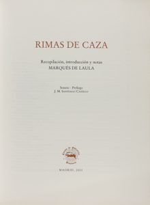2001. LIBRO : (CAZA-BIBLIOFILIA). MARQUES DE LAULA: RIMAS DE CAZA. Recopilación, introducción y notas Marqués de Laula. Soneto-prólogo J.M. Santiago Costelo. Madrid : Círculo de Bibliofilia Venatoria, 2001. 4º mayor. 285 p. + 2 h.