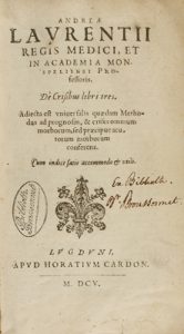 1605. LIBRO : (MEDICINA). LAURENTII, ANDREAE: DE CRISIBUS LIBRIS TRES. Lugduni [Lyon] : Apud Horatium Cardon, 1605. 8º. 4 h. + 137 p. + 3 h.