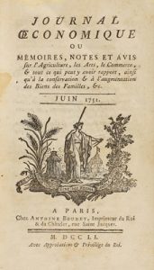 1751-1754. LIBRO : (ECONOMIA). JOURNAL ECONOMIQUE OU MÉMOIRES, NOTES ET AVIS ... (8 VOL.). Paris : Chez Antoine Boudet, 1751-1754. 8 vol. en 8º. 2 vol. por año, 550 p. c/u. aprox.