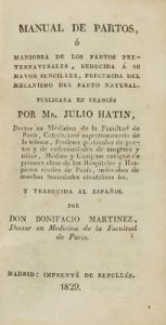 1829. LIBRO : (MEDICINA-OBSTETRICIA). HATIN, JULIO: MANUAL DE PARTOS Ó MANIOBRA DE LOS PARTOS PRETERNATURALES, REDUCIDA Á SU MAYOR SENCILEZ, PRECEDIDA DEL MECANISMO DEL PARTO NATURAL. Traducida al español por D. Bonifacio Martínez....