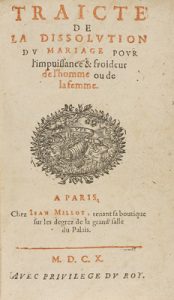 1610. LIBRO : (DERECHO). TRAICTE DE LA DISSOLUTION DU MARIAGE POUR L´IMPUISSANCE & FROIDEUR DE L´HOMME OU DE LA FEMME. Paris : Chez Iean Millot, 1610. 8º menor.